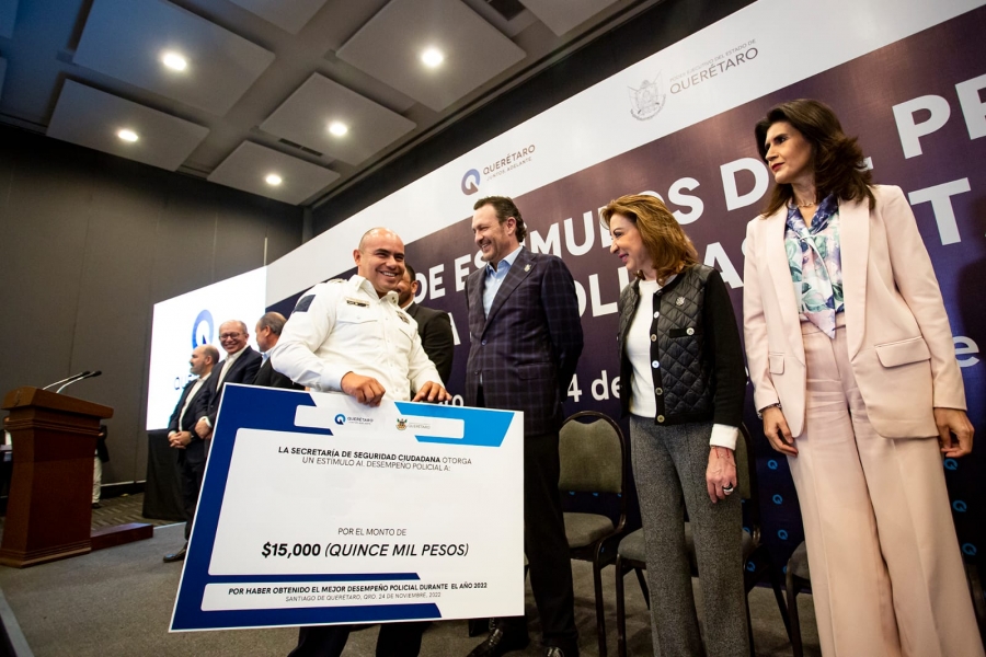 Querétaro, Qro., 24 de noviembre de 2022.-En Querétaro la seguridad se trabaja con planeación, estructura y coordinación, afirmó el gobernador, Mauricio Kuri González, al encabezar la entrega de 140 estímulos al Desempeño Policial y Capacitación del Programa a la Eficiencia de Policías Estatales 2022.
