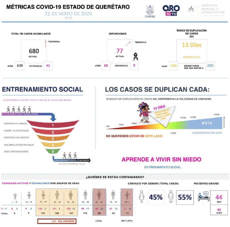 Si presentas al menos dos de los siguientes signos o síntomas: fiebre, tos, dolor de cabeza; acompañados de alguna de estas molestias: dificultad para respirar, dolor de articulaciones o músculos, dolor de garganta, conjuntivitis, escurrimiento nasal o dolor de pecho, comunícate al call center estatal 442 1015205, para recibir orientación médica y psicológica. Es importante no automedicarte.