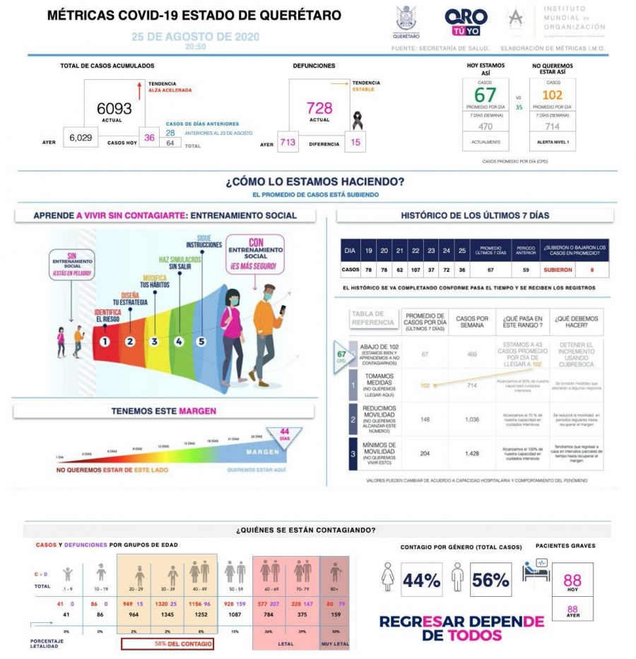 En la entidad se tiene un registro acumulado de seis mil 93 casos de COVID-19; 44% son mujeres y 56% son hombres.