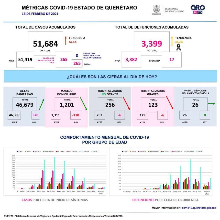 En Querétaro, dos mujeres -de 36 y 52-, y seis hombres -de 36, 39, 43, 57 y 60 años-, sin comorbilidad, así como siete hombres -de 34, 54, 59, 64, 72, y 87-, y dos mujeres -de 62 y 64 años-, con diversas comorbilidades, que se encontraban hospitalizados, fallecieron a causa de COVID-19.