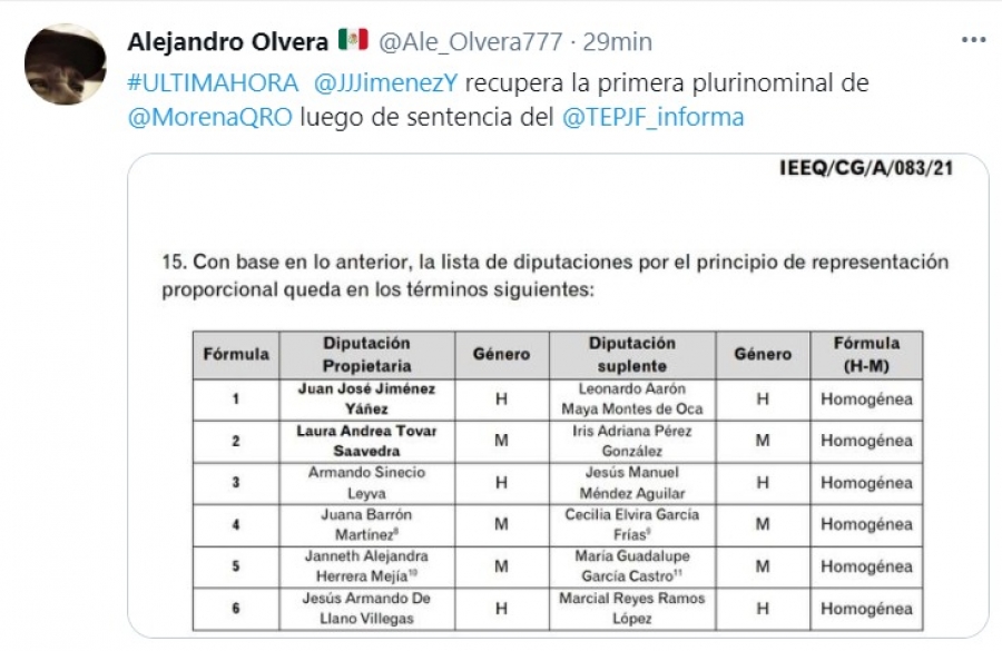 El ordenamiento judicial indica que el expriísta Juan José Jiménez y Laura Tovar deberán ocupar las primeras posiciones de dicho listado, lo que echó abajo resolución del Tribunal Electoral del Estado de Querétaro (TEEQ) que había causado las modificaciones para que dichas posiciones fueran ocupadas por Miguel Ángel Arteaga y Andrea Novoa.