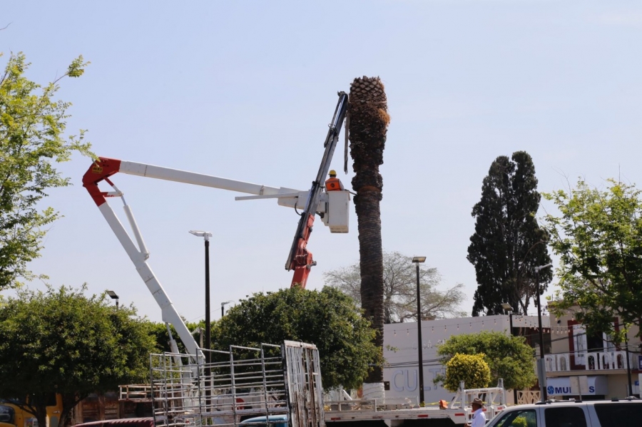 Ezequiel Montes 11 de abril de 2022.-Este lunes 11 abril del 2022 la Dirección de Protección Civil, Servicios Públicos, la Dirección de Ecología así como la Dirección Agropecuaria de Ezequiel Montes comenzaron el retiro de las once palmeras que se encuentran en el jardín principal “Adolfo López Mateos”.