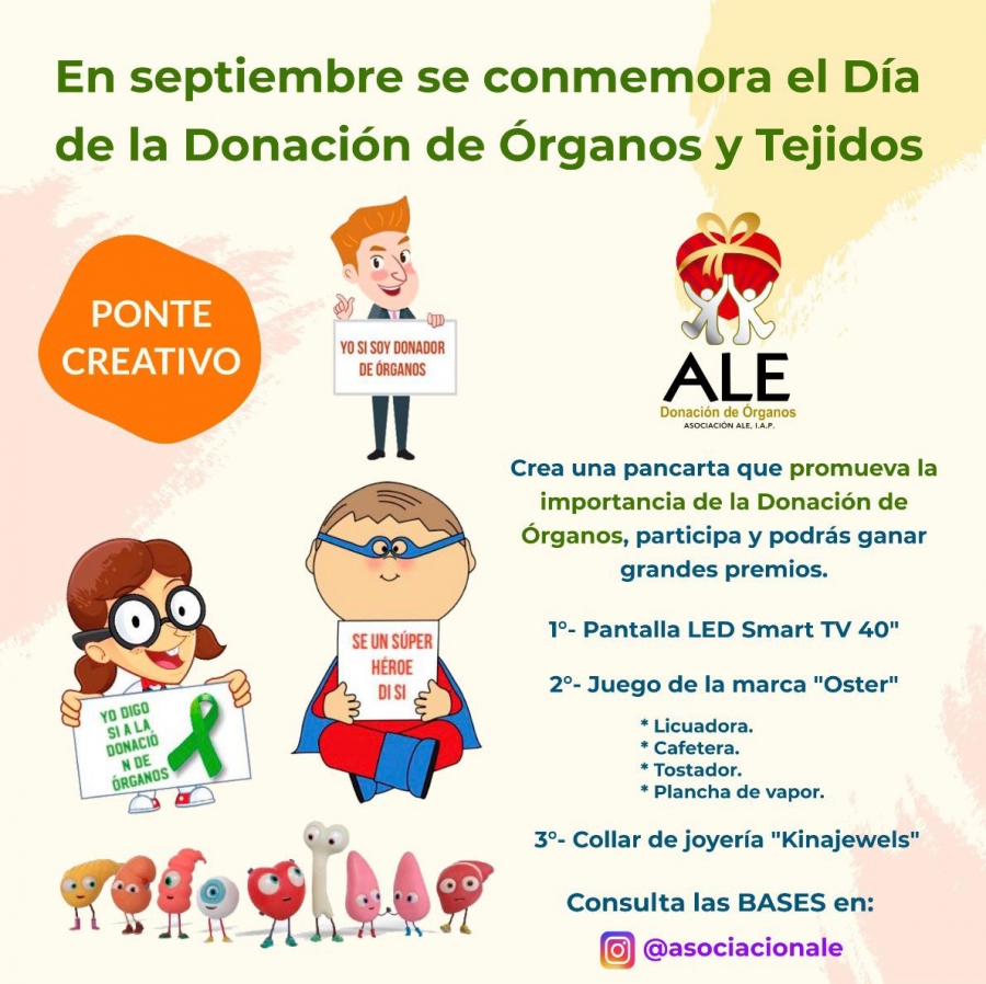 La Asociación ALE convoca al concurso Día de la Donación de Órganos, que llevarán a cabo el próximo 26 de septiembre, dentro de su campaña permanente para salvar vidas a través de la donación de órganos y tejidos.