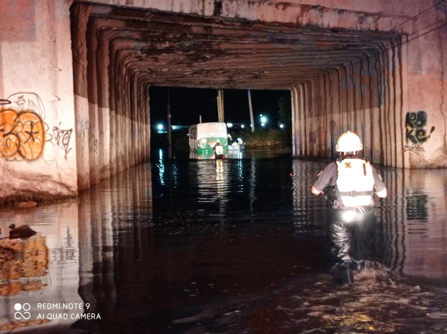Atendiendo el número único de emergencias 911, personal experto en rescate sobre agua, acudió al lugar luego de que el conductor de la ruta de transporte público federal, ignorara las indicaciones de la policía municipal, quienes se encontraban abanderando para evitar el tránsito vehicular.