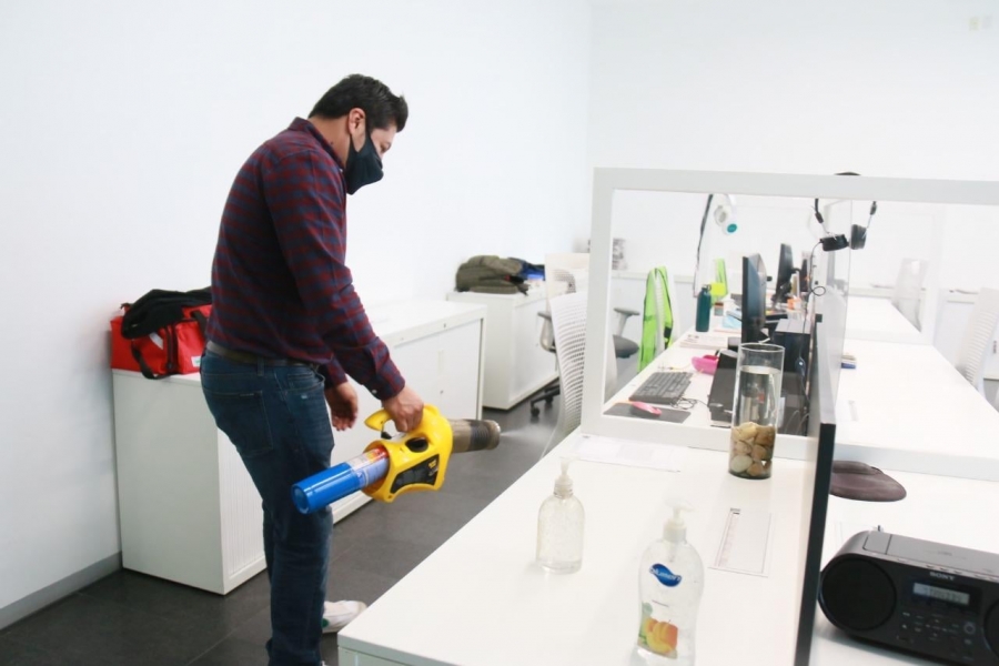 También están colocados medios sanitizantes para calzado y manos en el acceso al edificio, a efecto de mitigar el riesgo de contagio y se cuenta con dispensadores de gel desinfectante con base alcohol al 70% en cada oficina. Además, se supervisa, sin excepción, el uso de cubrebocas en todos los espacios del recinto y durante toda la jornada laboral.