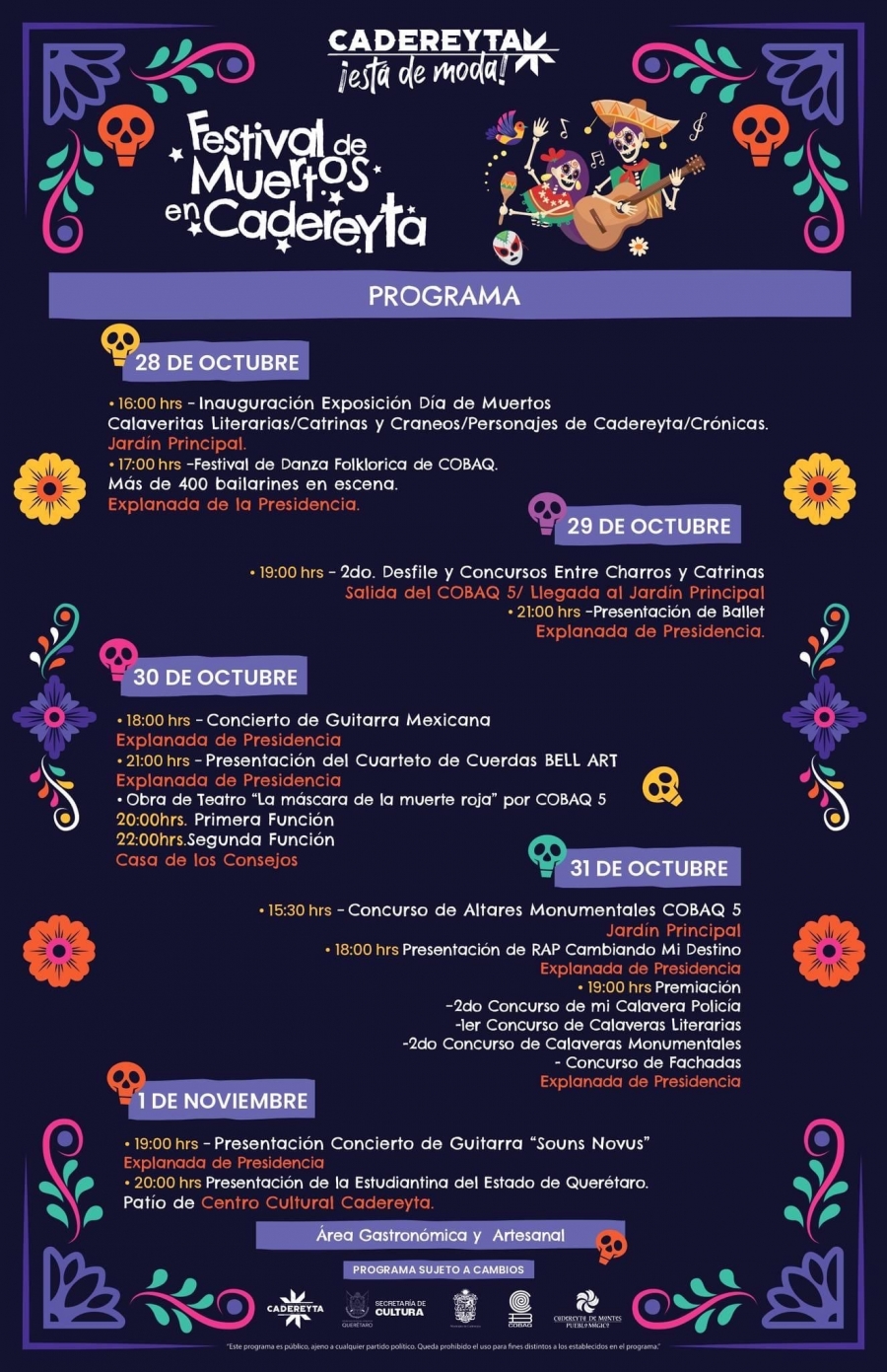 El programa de actividades abre el 28 de octubre con la inauguración de la exposición de Día de muertos (calaveritas literarias, catrinas y créanos, personajes de Cadereyta/ Crónicas), además del festival de danza folklórica del COBAQ)” Comentó el alcalde.