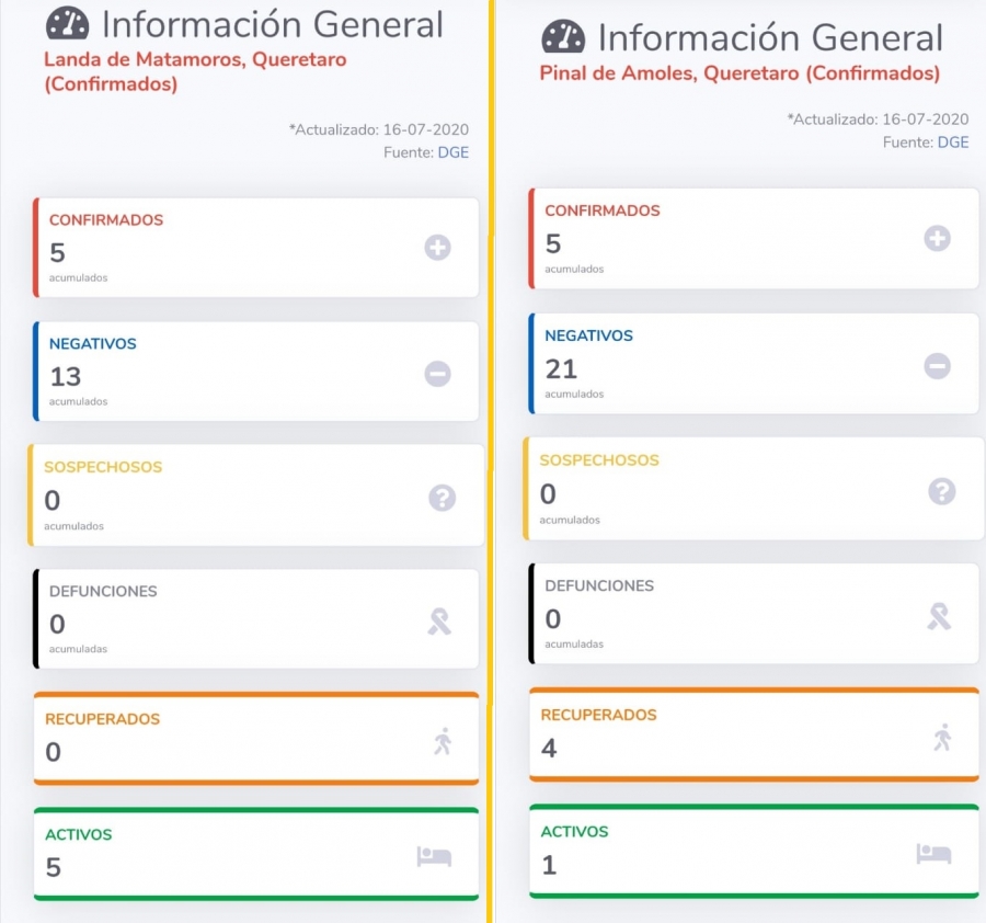 Landa de Matamoros, Qro., jueves 16 de julio de 2020.- Este jueves, los municipios de Landa de Matamoros y Pinal de Amoles reportaron nuevos casos de COVID-19 de acuerdo con los datos actualizados en la página https://coronavirus.gob.mx/datos/ del gobierno federal.