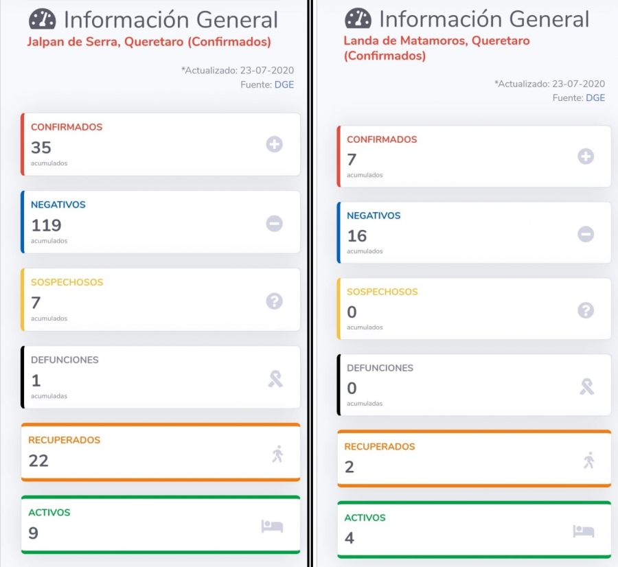 Jalpan de Serra, Qro., jueves 23 de julio de 2020.- Esta noche, tras la actualización de los datos de la pandemia de COVID-19 en nuestro país, la plataforma https://coronavirus.gob.mx/datos/ del gobierno de la república, reveló que los municipios de Jalpan de Serra y Landa de Matamoros sumaron nuevos casos confirmados de la enfermedad.