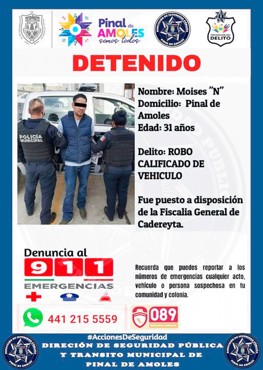 Pero al ser consultado sus generales, la base de datos arrojo que tenía una orden de aprensión vigente por el delito de robo de vehículo, por lo que se notificó a las autoridades correspondiente y después fue trasladado y puesto a disposición de la Fiscalía General con sede en Cadereyta de Montes.