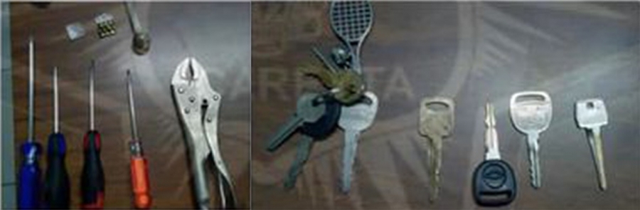 Motivo por el cual el personal de seguridad se acercó a los masculinos y al realizarles una inspección se les encontró entre sus pertenencias varias llaves limadas, desarmadores, dos bolsas transparentes con sustancia cristalina similar a la metanfetamina, una pipa con residuo cristalino y una llave de presión.