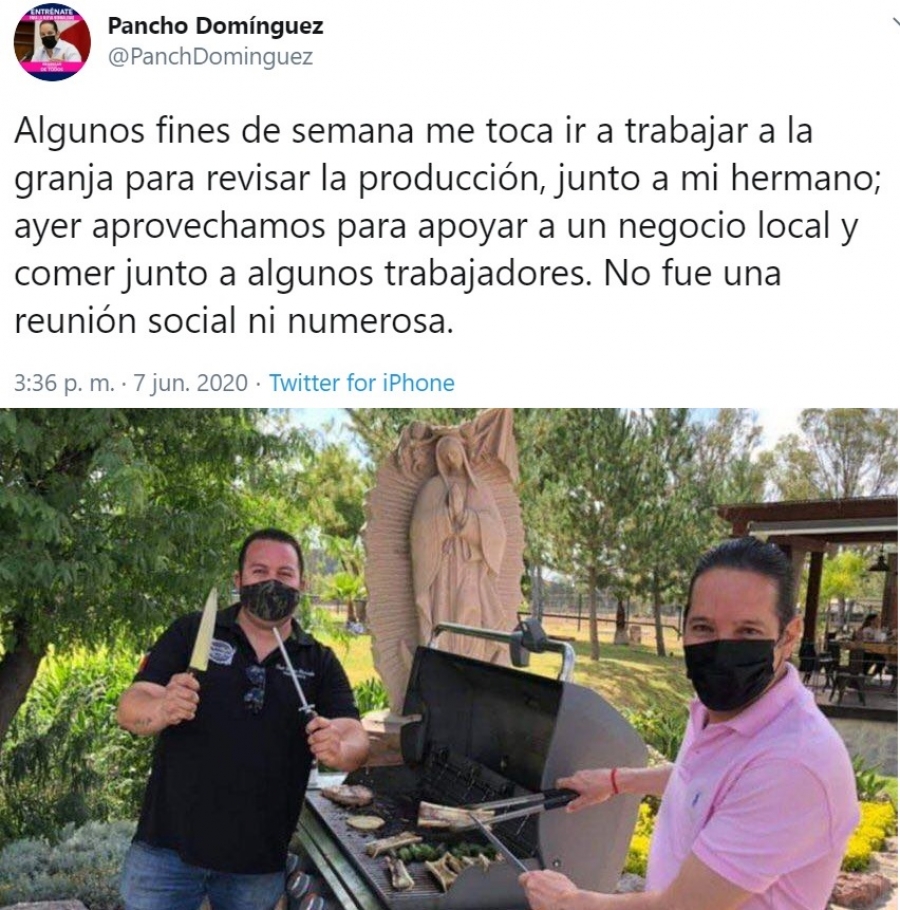 Querétaro, Qro., 8 junio de 2020.- Luego de que fueran difundidas a través de las redes sociales, imágenes que muestran al gobernador Francisco Domínguez, disfrutando de una comida en compañía de tres personas, el mandatario estatal publicó un tweet en el que asegura que no se trató de una reunión social, sino únicamente de una convivencia que involucraba a su hermano y al personal de una empresa local.