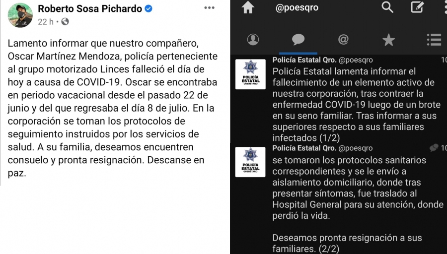 Por su parte, la Policía Estatal del estado de Querétaro informó que un elemento de la corporación perdió la vida luego de que se registrara un brote de COVID-19 en el seno de su familia.