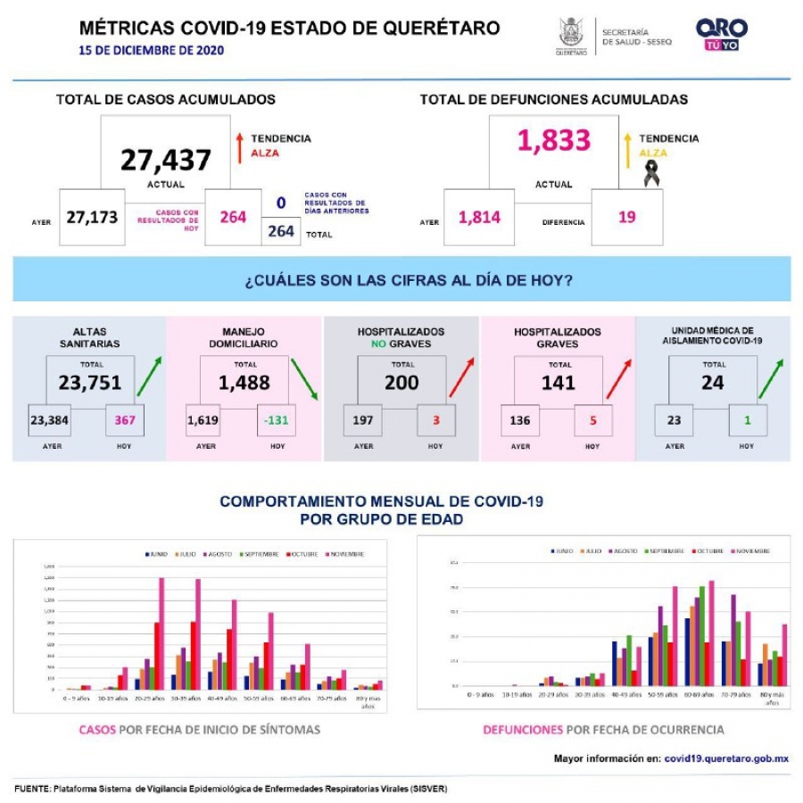 En el estado se suman 264 casos de COVID-19; se trata de 129 mujeres y 135 hombres, entre ellos uno de un año.