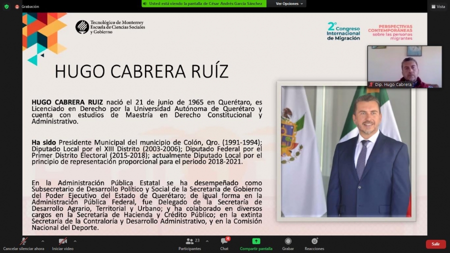 Hugo Cabrera describió la relevancia económica que tienen para Querétaro los migrantes; además del trabajo que se realizó atendiendo a las nuevas circunstancias a las que se enfrentaban por la pandemia, tanto para proteger su salud y derechos, como para mitigar las afectaciones económicas que tuvieron los migrantes y sus familias.