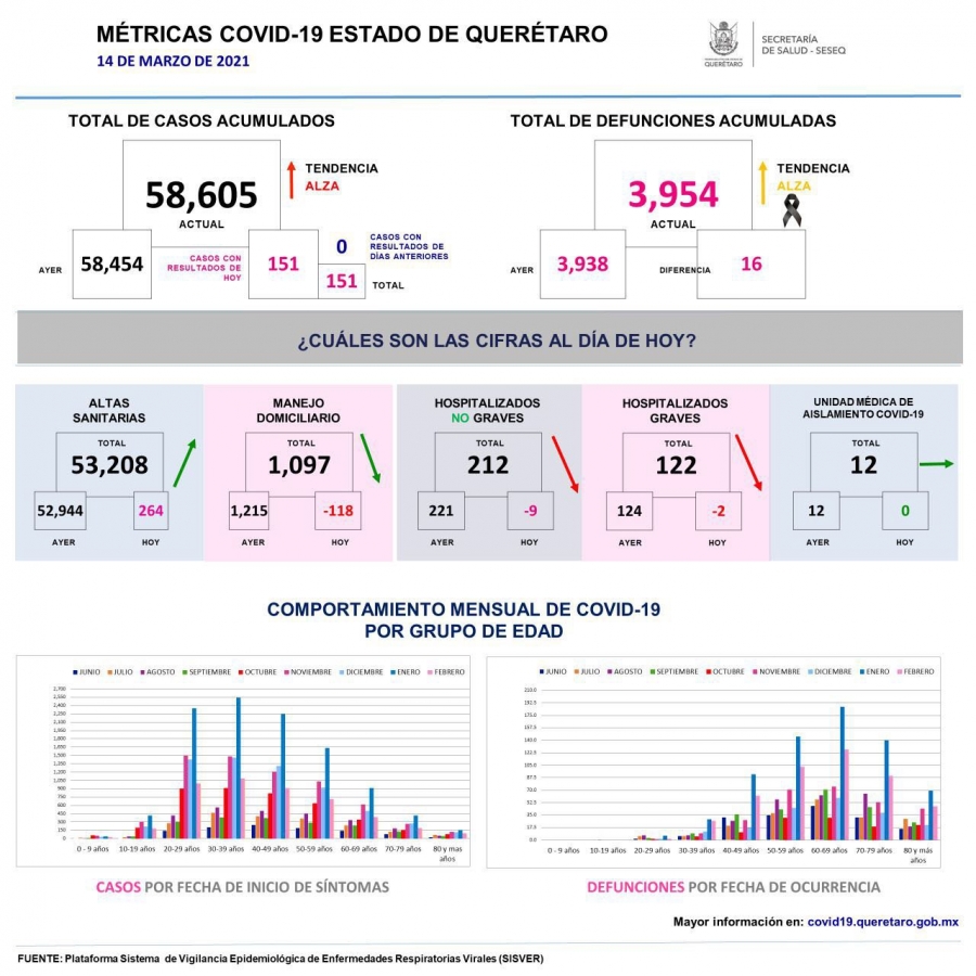 En Querétaro, dos mujeres -de 46 y 68 años-, y tres hombres -de 58, 62 y 73-, sin comorbilidad, así como seis hombres -dos de 40, 47, 66, 72 y 77-, y cinco mujeres -de 45, 62, 63, 65 y 67 años-, con diversas comorbilidades, que se encontraban hospitalizados, fallecieron a causa de COVID-19.