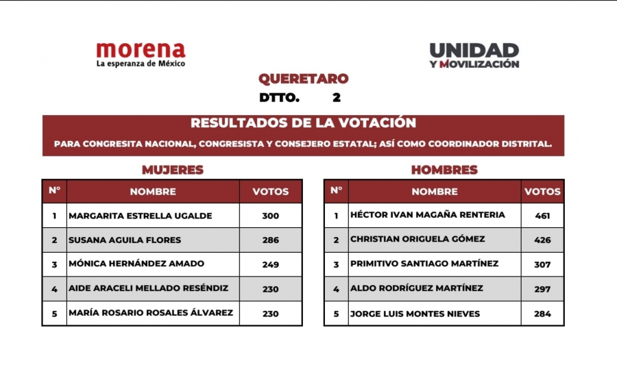 Así mismo, en el III distrito, se inscribe a Maribel Barrón Soto, Beatriz Adriana Cruz Sánchez, Jovita Escobedo Estrada, Susana Rocío Rojas Rodríguez (ex representante de Morena ante el IEEQ), Elizabeth Olvera Hernández, el actual dirigente Mauricio Alberto Ruíz Olaes, Carlos Alberto Maya Aguilar, Bernabé Adame Dimas, Rogelio Campos Chávez y Roberto Mora Morales.