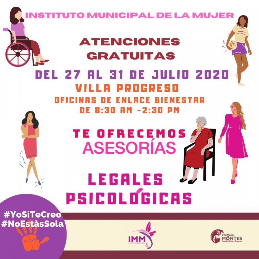 La Directora del Instituto Municipal de la Mujer en Ezequiel Montes, Ma. Margarita Montes Velázquez, anunció que se estará dando atenciones gratuitas como asesorías legales y psicológicas del 27 al 31 en Villa Progreso en las oficinas del Enlace Bienestar de 08:30 a 14:30.
