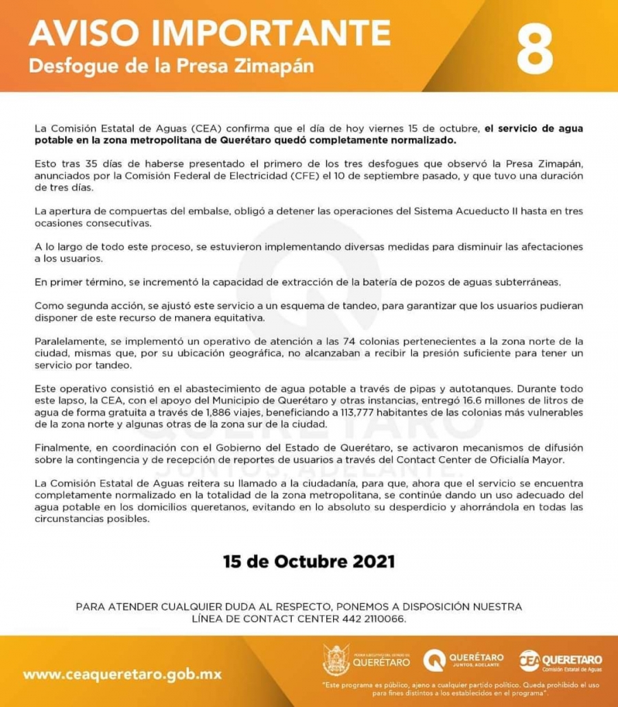 La Comisión Estatal de Aguas (CEA) confirma que el servicio de agua potable en la zona metropolitana de Querétaro quedó completamente normalizado esto tras 35 días de que se presentó el primero de los tres desfogues en la presa Zimapán, anunciado por la Comisión Federal de Electricidad (CFE).