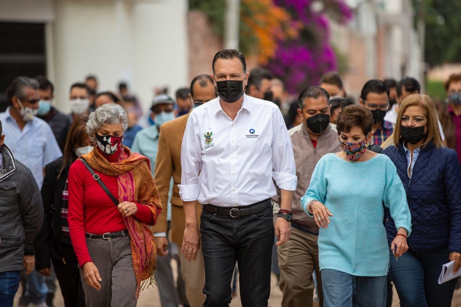 Querétaro, Qro., 24 de octubre de 2021.- El gobernador del estado, Mauricio Kuri González, recorrió las obras que se realizan en el fraccionamiento Calesa 1a Sección y 2da Sección, así como en El Cortijo y La Peñita; acciones que cuentan con una inversión de más de 90 millones de pesos para mejoras al mobiliario urbano que incluye pavimento adocreto, huellas de rodamiento de concreto, señalamiento horizontal, banquetas, rampas, sustitución de drenaje sanitario y agua potable, canalización eléctrica, guarniciones y colector pluvial.