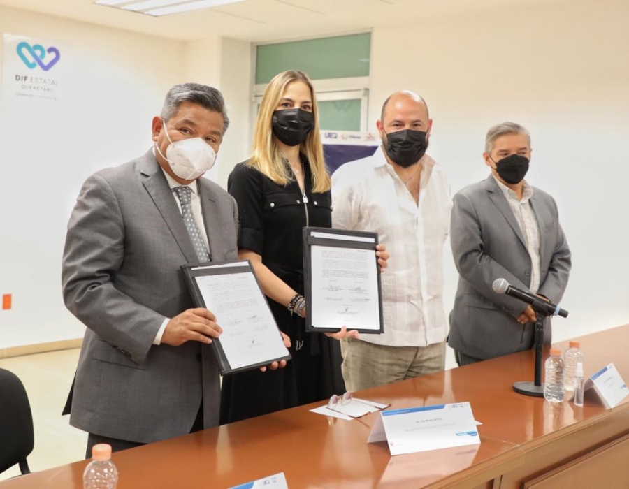 Querétaro, Qro., 19 de mayo de 2022.-En el marco del programa "De Corazón a Corazón", el Sistema Estatal DIF Querétaro firmó un convenio con la Universidad Tecnológica de Querétaro (UTEQ) con el objetivo de colaborar en proyectos de capacitación dirigidos a personas en situación vulnerable. La presidenta del Patronato del Sistema Estatal DIF, Car Herrera de Kuri, refirió que para la dependencia que representa es de suma importancia estrechar lazos con instituciones socialmente responsables que se preocupan por el bienestar de la sociedad queretana.