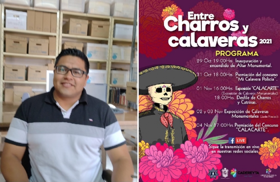 “Se llama Entre Charros y Calaveras para darle identidad a este programa por la parte de los charros cadereytenses, la talabartería y demás, tenemos un programa muy interesante que empieza el 29 de octubre a las 07:00 de la tarde se va a llevar a cabo la inauguración y encendido del altar monumental elaborado por el Colegio de Bachilleres de Querétaro (COBAQ) plantel 5 de Cadereyta por la razón de que antes de la pandemia año con año se venía realizando esta exposición de altares de muertos, en esta ocasión se les invitó para que realizaran un solo altar en la explanada de presidencia municipal, donde participan estudiantes y maestros del COBAQ en coordinación con el municipio”, expuso.
