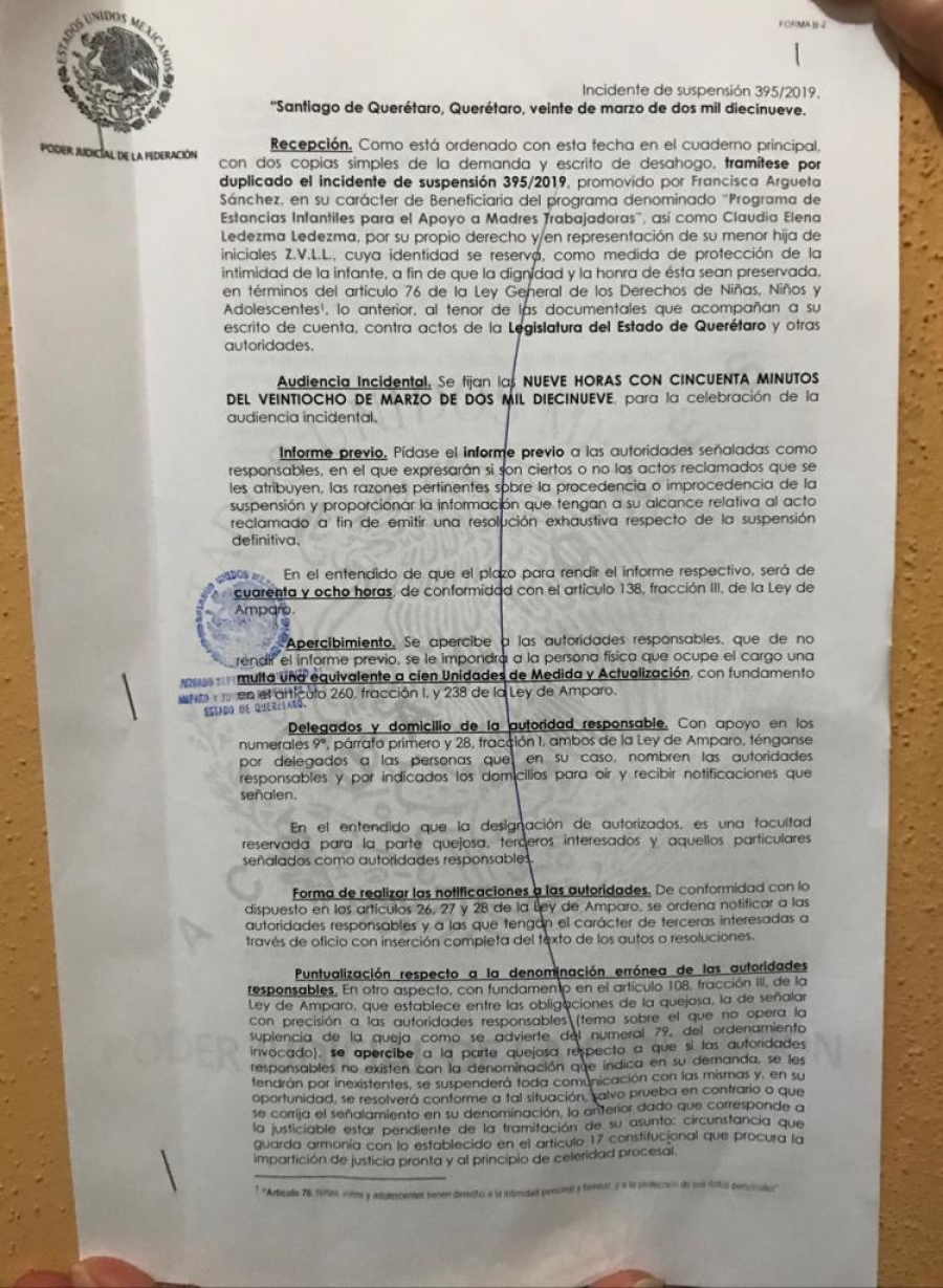 El documento fue emitido por la Jueza Séptima de Distrito de Amparo y Juicios Federales en el Estado de Querétaro, Gabriela Vieyra Pineda, con Incidente de Suspensión 395/2019 en el que se considera procedente el amparo, debido a que el Programa de Bienestar para Niñas y Niños –nombre que recibió el programa de Estancias Infantiles en 2019- no garantiza la prestación del servicio para los niños que ya eran beneficiarios, lo que contravendría el principio de progresividad y el interés superior del menor consagrado en la Constitución.