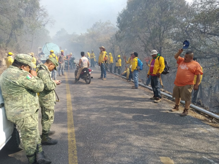 El día de hoy lunes, nuevamente se realizan las gestiones y permisos necesarios a través de la gerencia Estatal de CONAFOR para contar con un helicóptero con balde para rociar agua en los diversos frentes de fuego, una vez enfriados los puntos de calor, las brigadas podrán proceder a sofocar lo restante y aperturar brechas cortafuegos para lograr el control y extinguir el incendio.