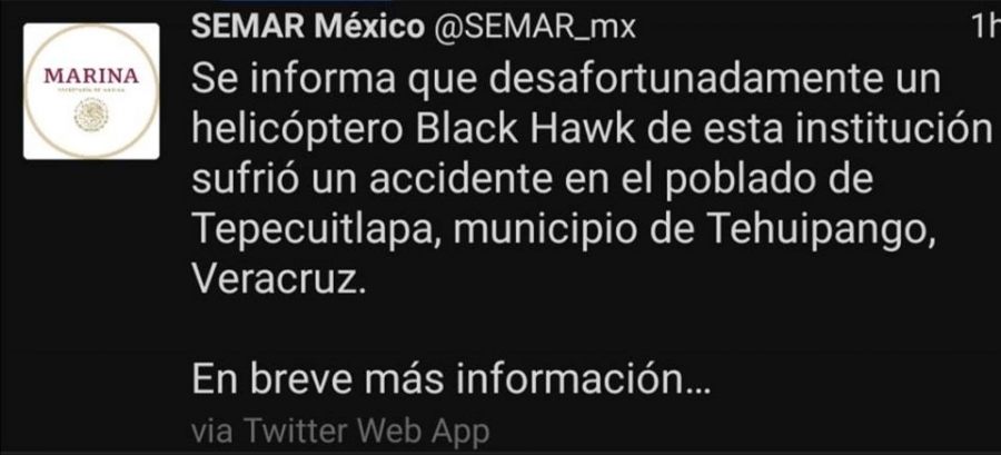 Esta tarde, el Twitter oficial de la Secretaría de Marina de México confirmó la caída de un helicóptero en la comunidad de Tepecuitlapa, perteneciente al municipio Tehuipango en el estado de Veracruz.