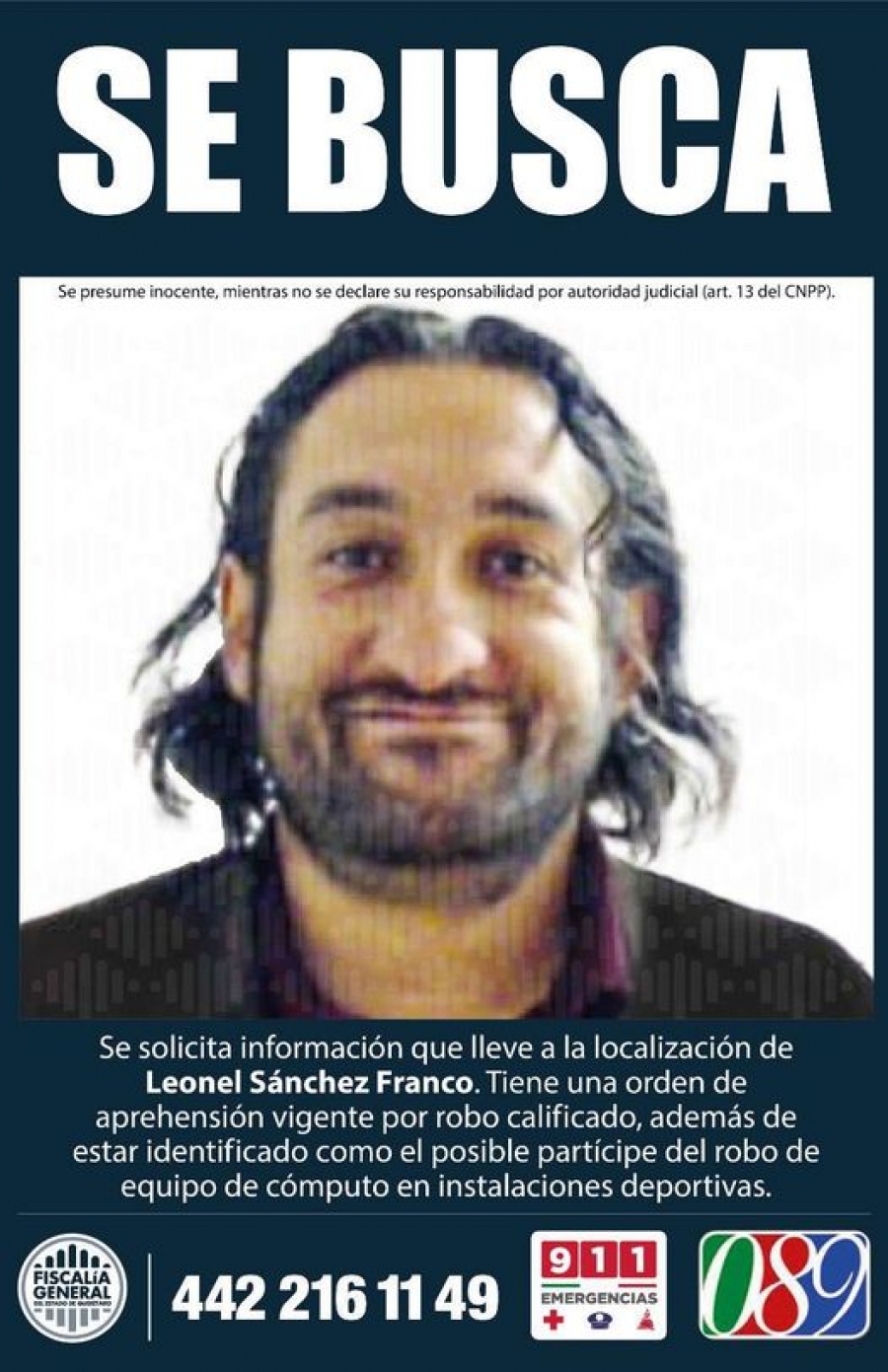 Esta persona se encuentra sustraída de la acción de la justicia, quien cuente con información puede proporcionarse al número de la Policía de Investigación del Delito: 442 216 1149, a la línea de emergencias 911 o de manera anónima al 089.