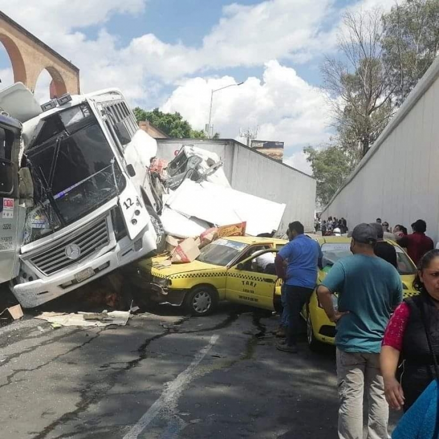 De nueva cuenta una unidad pesada protagonizo un aparatoso accidente en carriles laterales de la autopista México-Querétaro, luego de que el trailer bajara a gran velocidad y aparentemente quedar sin frenos se metió a los carriles laterales golpeando a varios vehículos entre ellos camiones de transporte público.